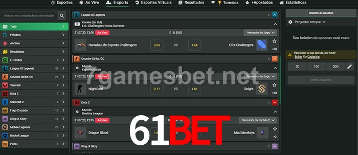 O 61Bet oferece uma grande seleção de opções de apostas em e-sports com probabilidades competitivas